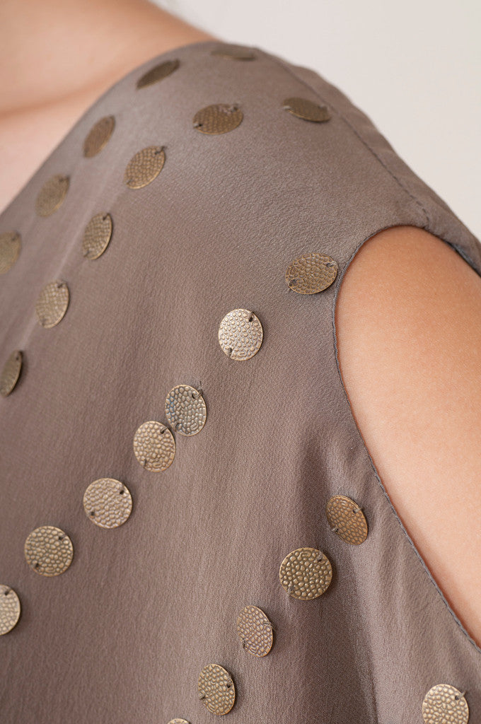 with its boxy, slightly cropped cut, exposed shoulder panels, and hardware detailing in the front, this top by aryn k is sure to be an eye-catcher. made of pure silk and fully lined with a sheer polyester lining, this top is a classy, grown-up version of a "going-out" top. pair with a miniskirt or, if you're feeling adventurous, try layering over a small black dress or jumpsuit.