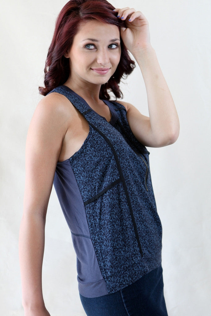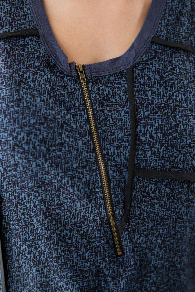 this navy tank by line and dot features a printed front with an asymmetric zipper and black piping. the back is solid with geometric stitching detail. made of rayon, this tank is sure to keep you feeling and looking cool. pair with khakis or jeans for an easy daytime look, or dress up with a miniskirt.